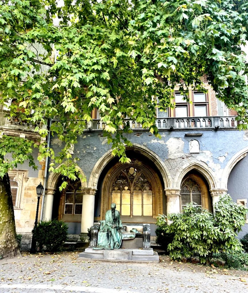 Alzando lo sguardo, ci ha colpito un affascinante scorcio della Az Apostolok tornya (Torre degli Apostoli), accanto alla quale si erge la statua di Sándor Károlyi de Nagykároly, figura di spicco della storia ungherese.