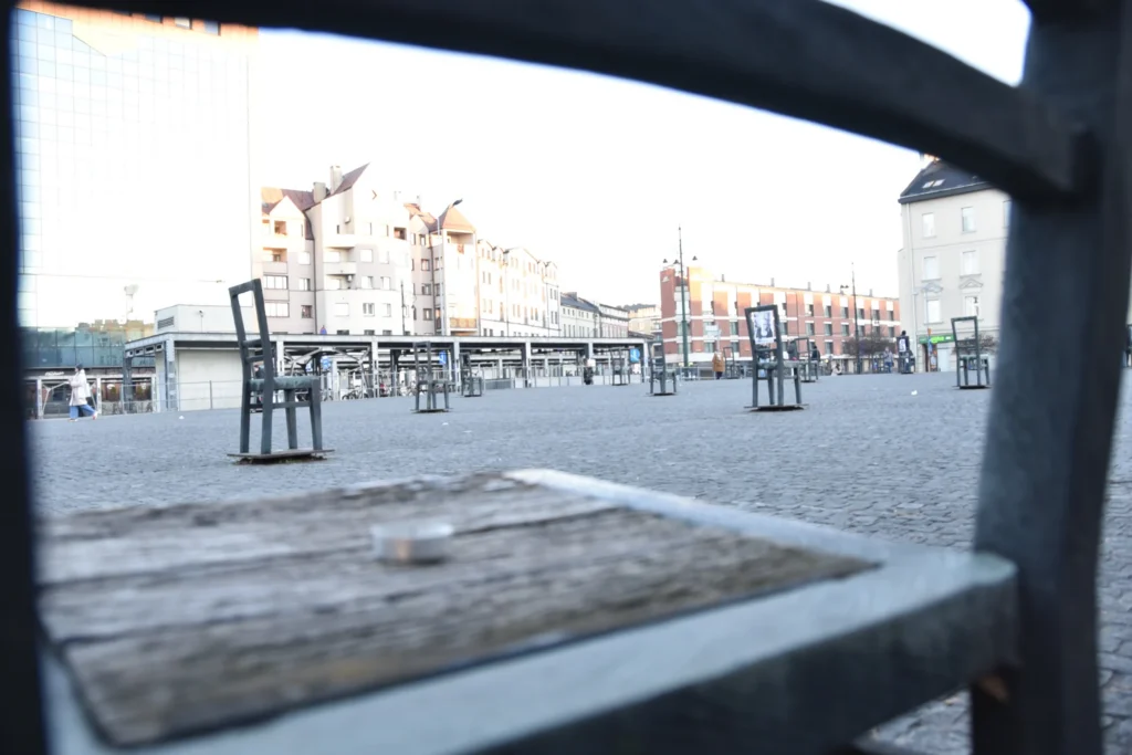 Al centro della piazza si trova una scultura molto significativa: una serie di sedie vuote disposte in modo tale da rappresentare la solitudine e il vuoto lasciato dalle vittime del ghetto.
